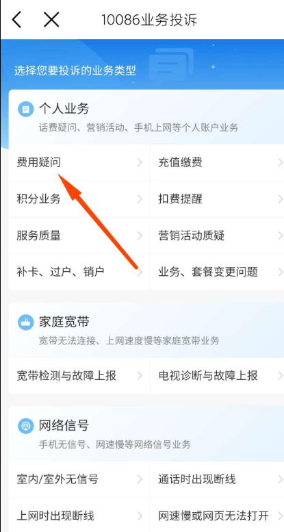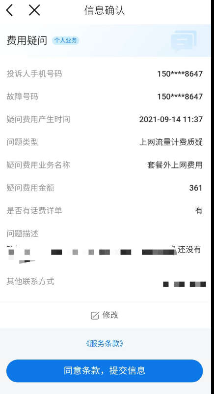 返回 我的 我的投诉 进去 自主填写工单费用问题
