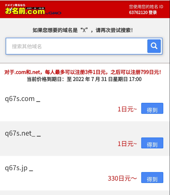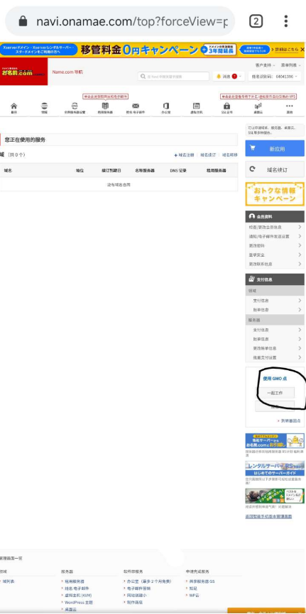 返回onamae的主页面,点击右上角的登录,把刚刚复制的id输入进去[滑稽],密码还是之前设置的[滑稽],登录会给你发个邮件验证,登录进去后会让你填写信息,这时候我们不用管,直接点右下角域名下面绿色的按钮,然后还是会填写信息[玫瑰][滑稽],自己去网站里面复制粘贴,填写完后点确认,还是到最后一步付款我们去https://navi.onamae.com/sp/top这里点击 一起工作 这样才能利用1日元,要电脑版网站才有这个选项改一下浏览器标识[滑稽]然后再点右下角的域名进行付款