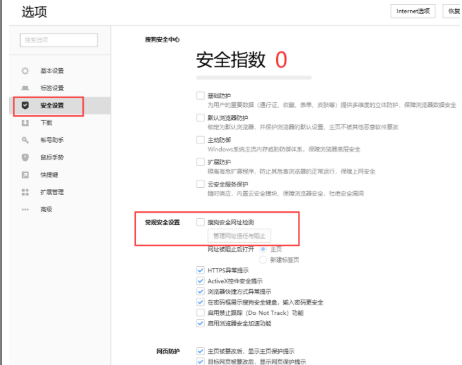 一。点击浏览器右上角的三条杠-选项-安全设置-在常规安全设置-搜狗安全网址检测一栏取消打勾。