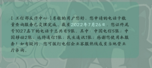 快速查询自己名下所有的手机卡 1.微信小程序搜索 通信行程卡 2.进入到大数据行程卡后点一证通查。 3.然后填写资料。 4.最后查看结果(1分钟左右)。