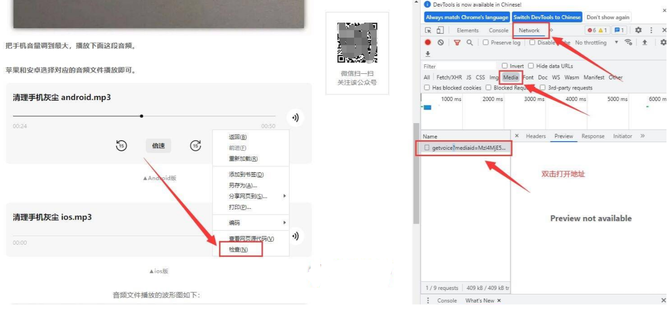 “检查”-“Network”-“Media”。然后点击音频开始播放, 便能在控制栏看到音频源地址,双击打开即可下载。