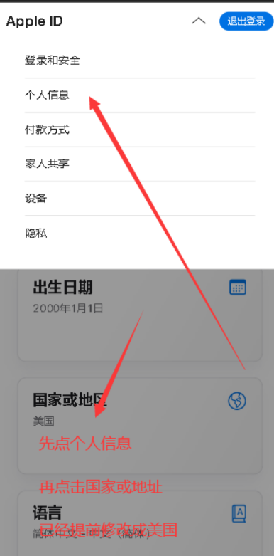 2.先点个人信息,再点国家或地址
