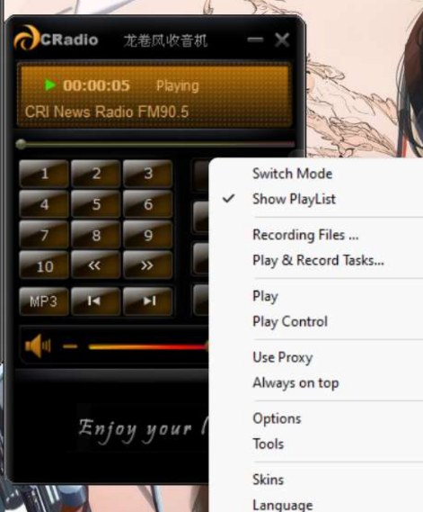 龙卷风收音机是一款倾心制作的免费的电台收听软件,可添加收听全球任意电台!还可以播放本地媒体文件,支持在线更新、内置录音、皮肤切换、多国语言、热键操作、断线自动重连、定时录音、定时播放、定时关机、语音报时等功能。