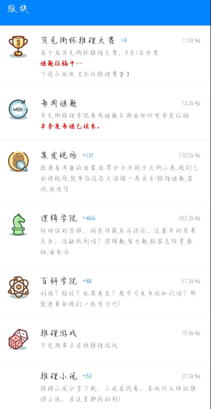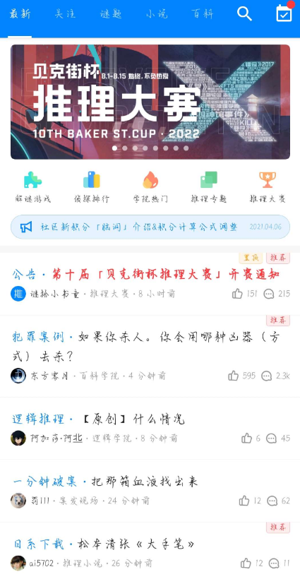 内容:贝克街推理学院是国内活跃的推理论坛,旨在为所有网络推理、推理小说的爱好者打造一个专业、丰富的推理平台。
