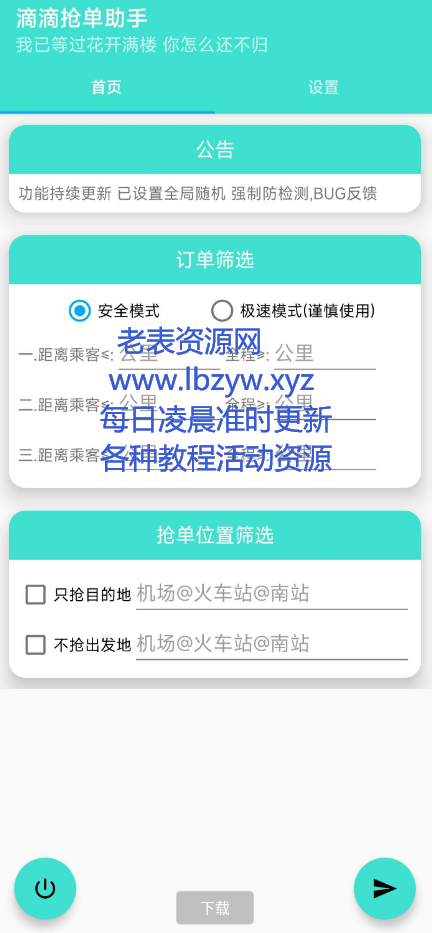 【资源名称】:灭霸D滴 【资源版本】:V2.0.0 【资源大小】:11.1mb 【测试机型】:红米10x5g版 【资源介绍】: 专门为滴滴车主打造的一款快速抢单工具,支持滴滴app最新版本,无广告无弹窗,所有能全都免费使用,轻松好操作,还有订单及位置的筛选功能,实用性极强。 【资源截图】: