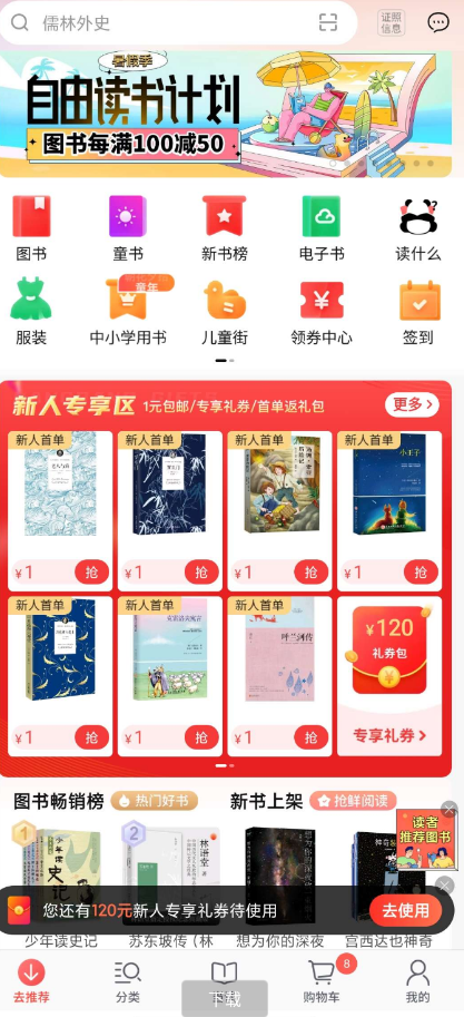 进入首页就可购买 新人 当当app 一元买书(新人)