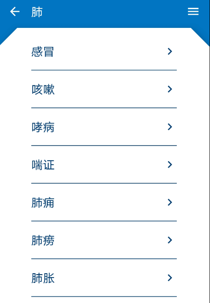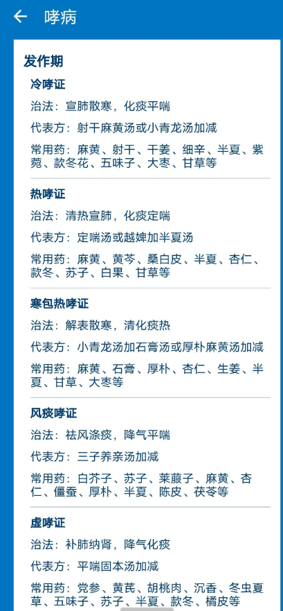 这款App可以查询人体内脏的中医辨证的开方,包括心、肝胆、脾胃、肺、肾、气血津液、肢体经络,以及常见病症。点击一项病症,进入详细介绍页面,主要介绍病症的治法、代表方、常用药名。