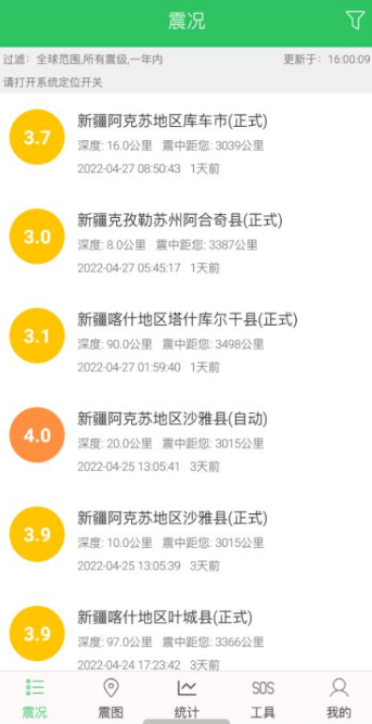 3、地震统计:统计指定时间段和范围内的历史地震记录,了解不同震级发生次数、离您最近的地震和震级最大地震。