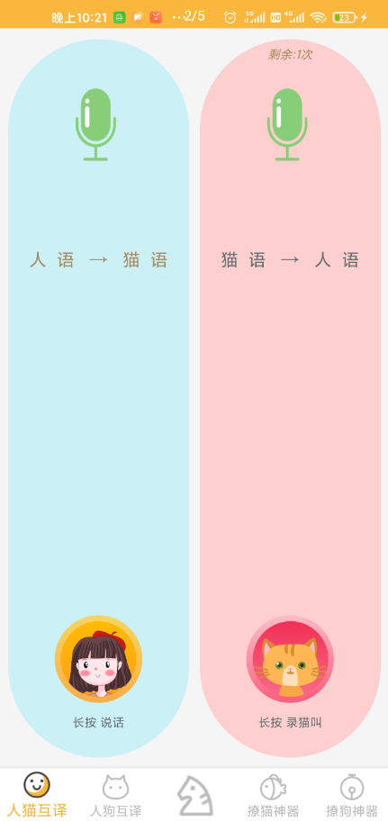铲屎官和猫猫、狗狗,猫语狗语翻译器 宠物猫狗在想什么?想和宠物猫狗交流? 即时将你的声音变换为宠物语翻译,获得宠物的注意力,聆听宠宠物心声助手