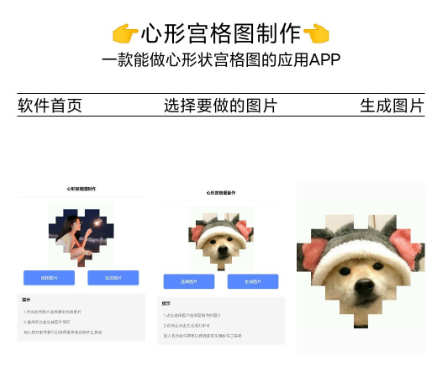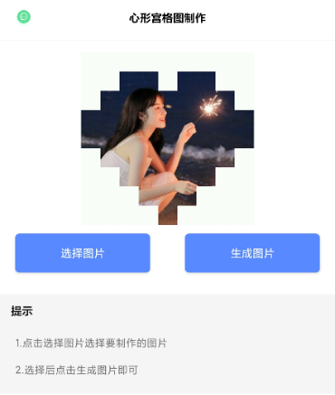 心形宫格图片制作,一键制作心形图片,宫格图 【应用名称】:心形宫格图制作 【应用包名】:com.xinxingggt 【应用版本】:1.0 【应用大小】:2.6M 【适用平台】:安卓 【官方介绍】:一键生成制作心形宫格图片,选择图片一键制作