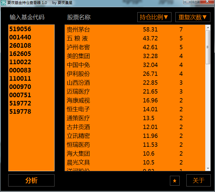 本软件可以查看自己喜欢的基金持仓股票情况,帮忙从众多基金里选出最看好的基金 左边输入基金代码,然后换行输入下一个,点击分析就OK了 赚了记得打开关于给我打钱