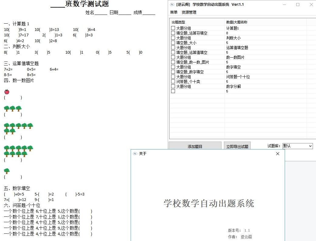 介绍:女朋友工作原因 需要一套数学题自动生成系统 所以 它来了 现在支持 运算符填空 运算元填空 运算值填空 比大小 数图片 个十位问答题 后面将支持分解式等 一键生成word文档 可以直接打印 爽歪歪