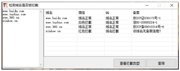 软件功能/说明: 注册域名之前可以查询一下域名是否被扣扣或VX拦截,避免注册了域名而无法在扣扣与VX中使用!