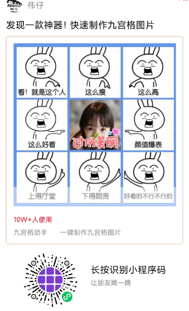 九宫格助手,一键生成九宫格图片说说 【微信小程序】:九宫格助手 【小程序版本】:3.0 【小程序大小】:0M 【小程序平台】:安卓Android/苹果ios 【测试机型】:小米10 【使用说明】:微信小程序里搜索名字或者扫码就可以进去使用了,壁纸,头像,套图,文案等等都是可以下载的哦!可以下载的哦!可以下载的哦!