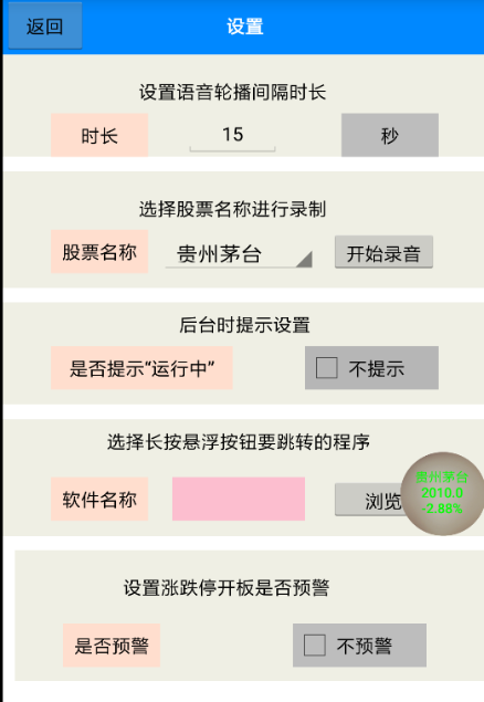 股票盯盘2.0股票悬浮窗支持语音轮播 【应用名称】:股票盯盘 【应用包名】:com.gpdp.myapp 【应用版本】:0.2.0 【应用大小】:5.29MB 【适用平台】:Android