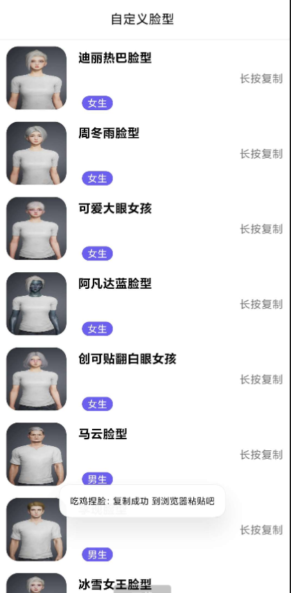 【软件名称】:吃鸡捏脸 【应用版本】:1.0 【应用大小】: 3.12M 【适用平台】:安卓 【软件说明】:刺激战场之前不是出了捏脸功能,此软件打开复制代码 一键粘贴捏脸哦 拿着别忘记评论留言点赞哦[吐舌]