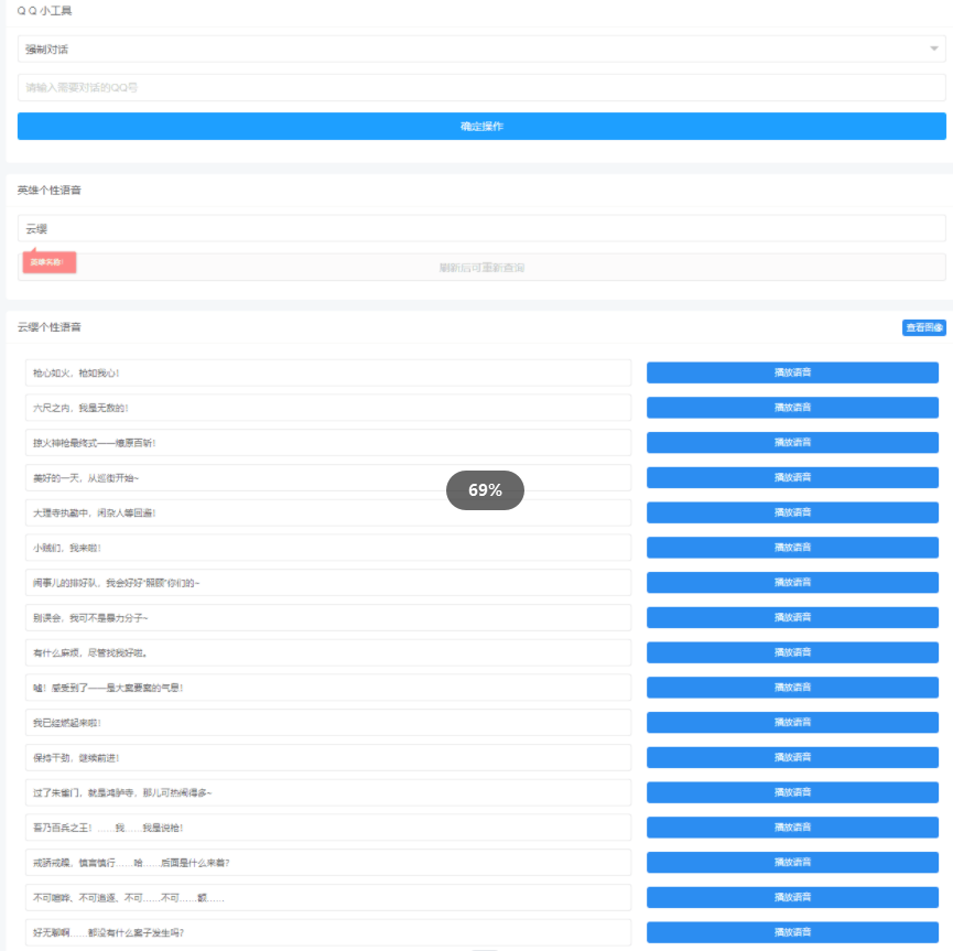 QQ在线小工具源码分享 功能列表 1、强制对话聊天 2、强制查看名片 3、获取空间说说 4、获取王者语音 源码大小 6.45mb 搭建教程 上传服务器或主机即可使用